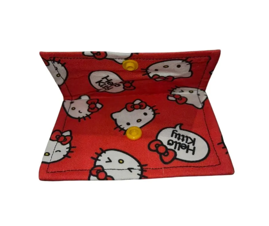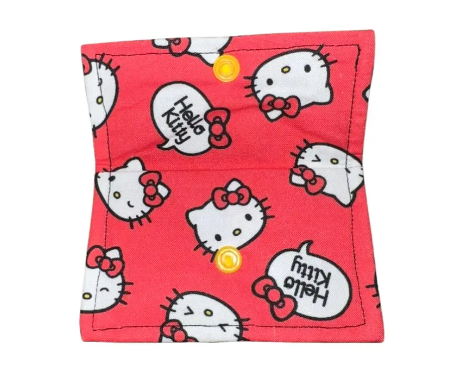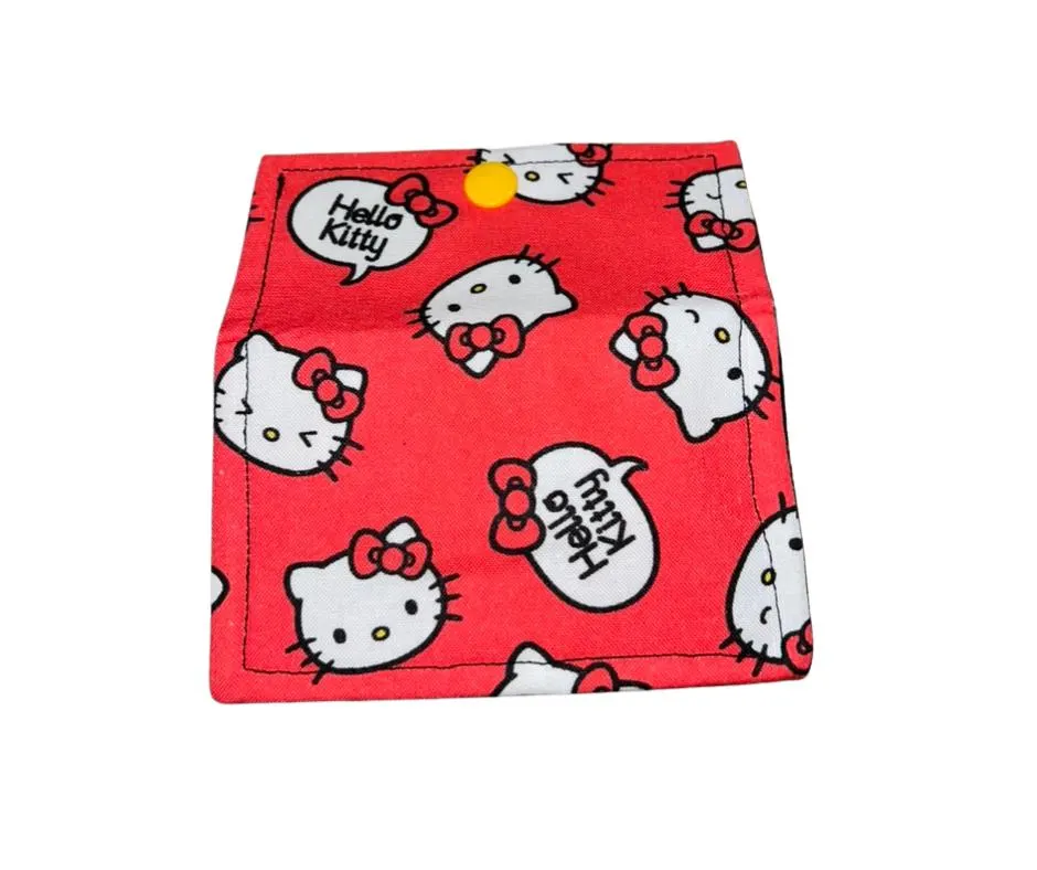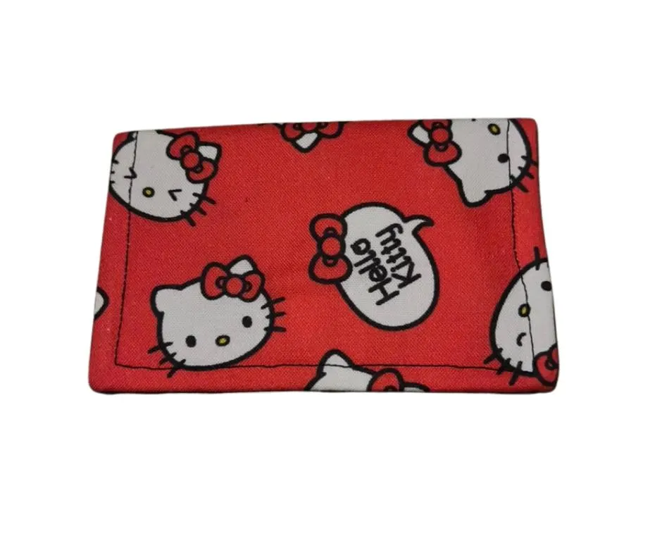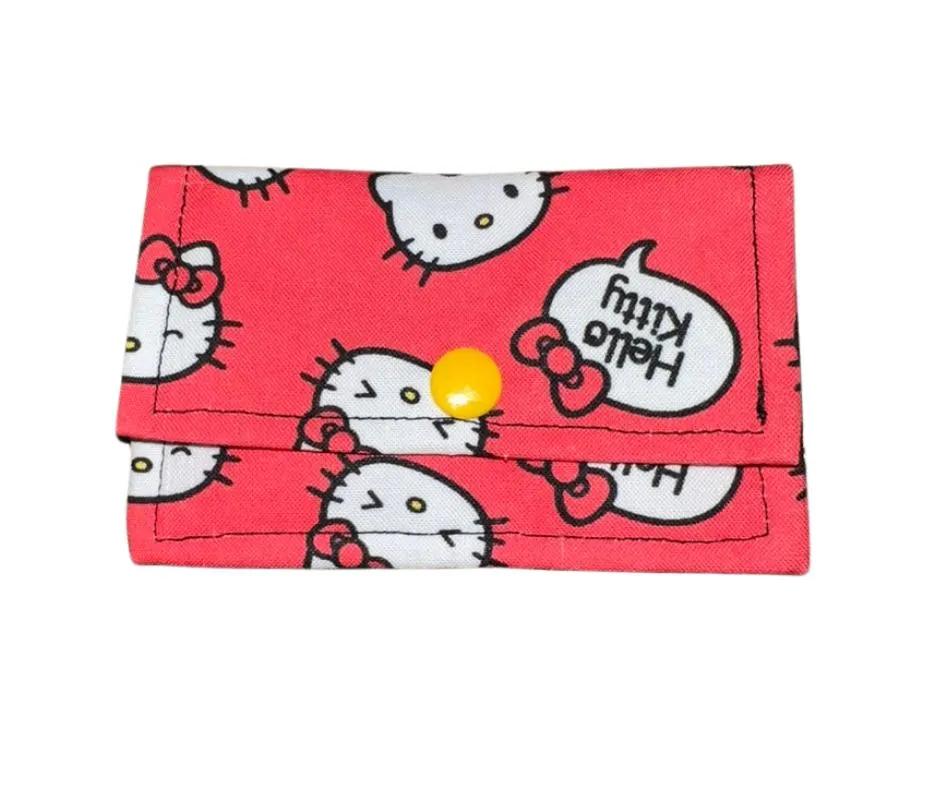 Say hello to adorable organization with this one-of-a-kind Hello Kitty fabric wallet! Lovingly hand-sewn, this wallet features a bright red background with playful Hello Kitty faces and speech bubbles, secured with a cheerful yellow snap button. It’s the perfect size for holding cash, cards, or small essentials, and makes a kawaii addition to any purse or backpack. Ideal for Hello Kitty fans, lovers of handmade goods, or anyone who wants to carry a bit of joy in their pocket!