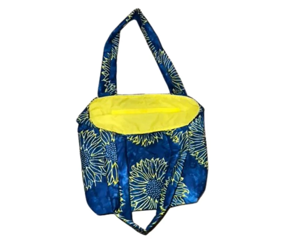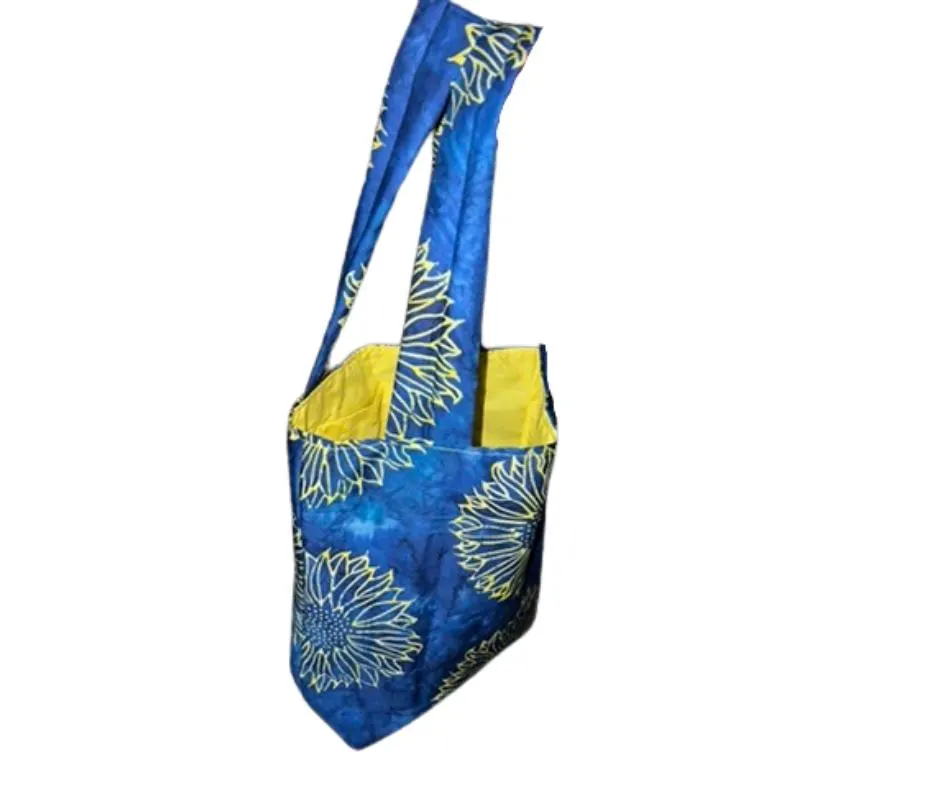Brighten up your day with this cheerful hand-sewn tote bag featuring bold yellow sunflower outlines against a stunning blue marbled background. The vivid contrast and oversized floral pattern make it a standout piece for any season. Fully lined for added durability, this tote is roomy enough to carry books, groceries, or beach essentials, all while adding a pop of sunshine to your outfit.